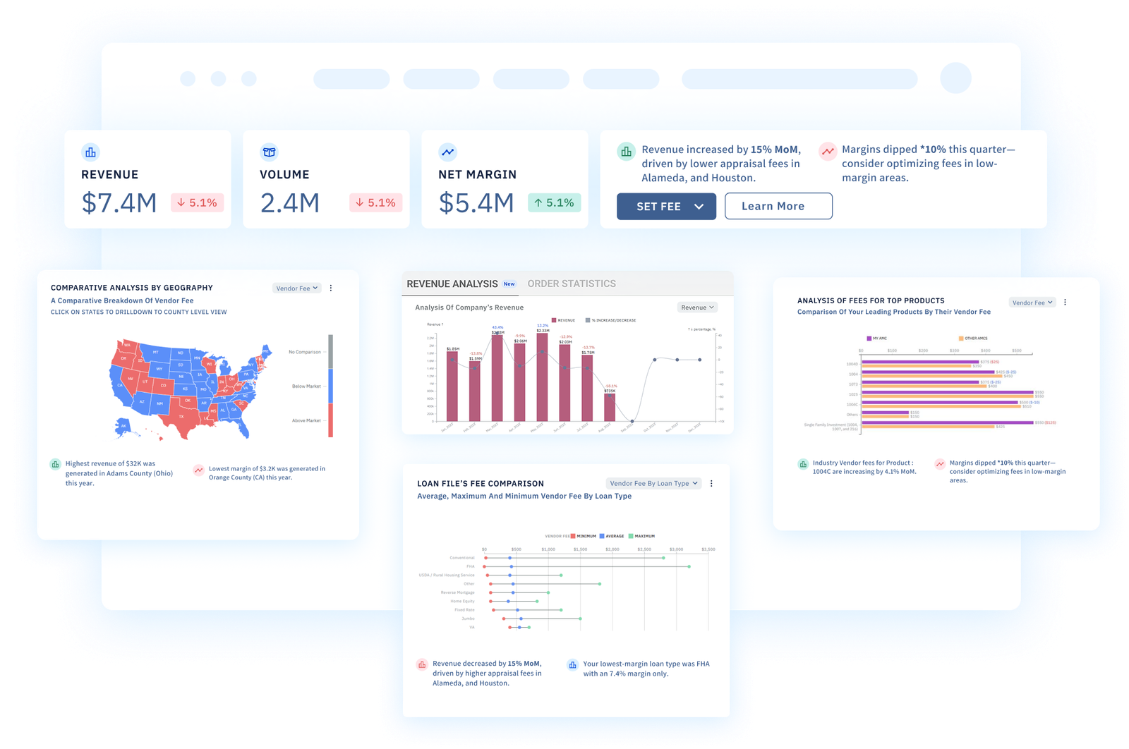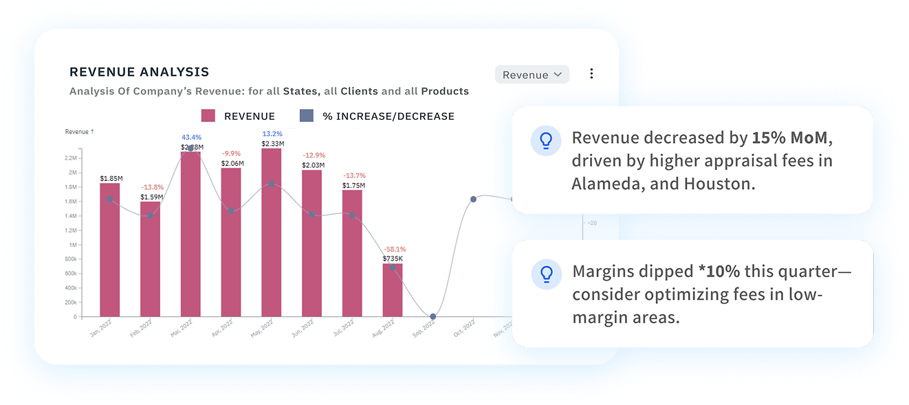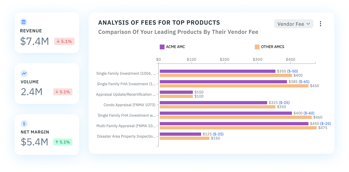 By providing regional and product-level visibility, we benchmark your data against industry trends and your own historical performance. Using our Fee Recommendations module, we identify opportunities for appraisal fee adjustments that help you optimize pricing, improve efficiency, and maximize profitability.